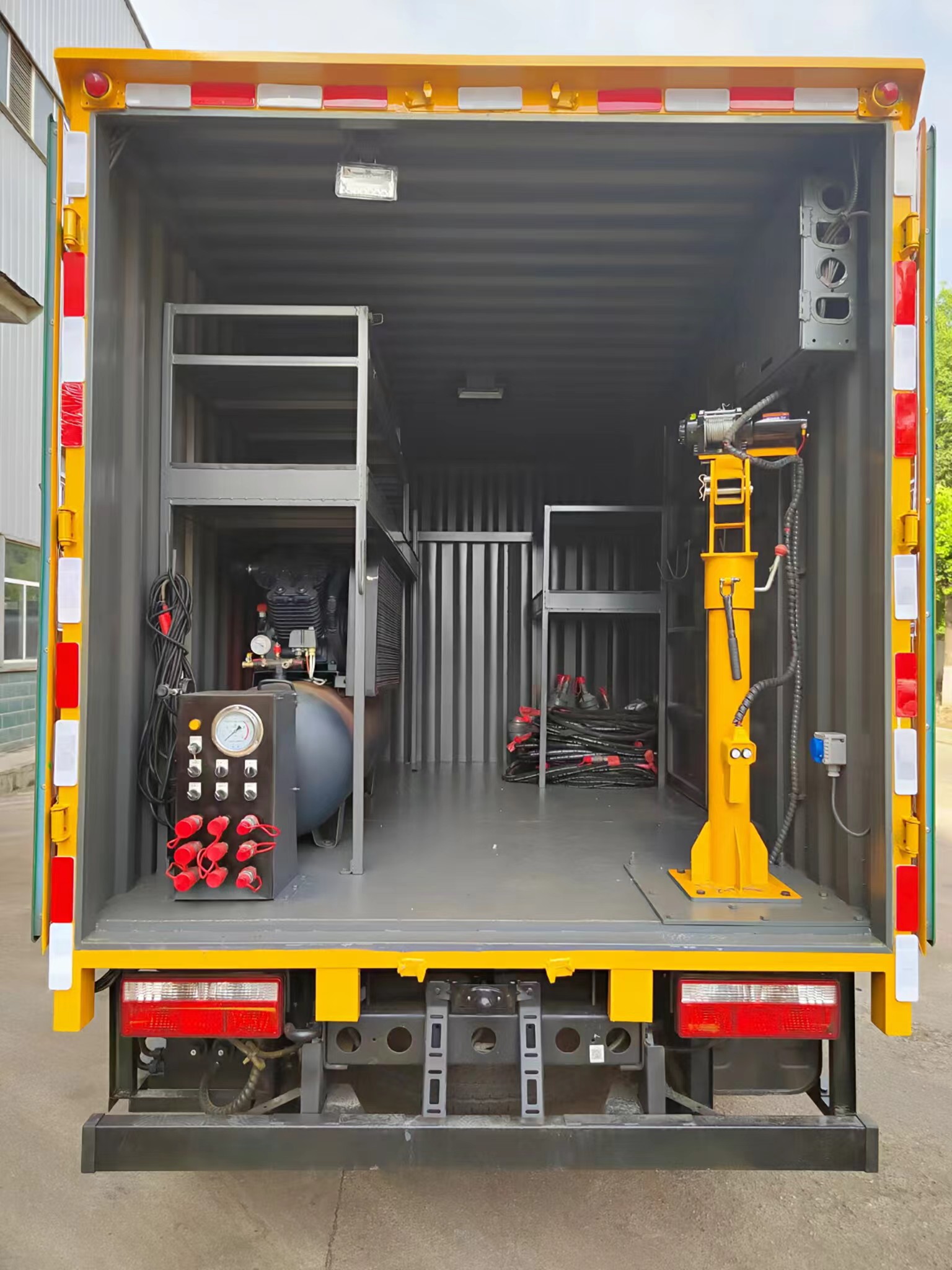 上裝配置 | 箱體采用瓦楞箱體,側面和后面各一個雙開門,箱內設計兩個貨架,箱內設計照明燈,安裝液壓動力系統,三套液壓動力取力快速接口,帶控制面板兩臺4寸的渣漿泵,帶水帶和液壓管(帶快接)裝一個液壓驅動空壓機,一個800公斤12V電控小吊機安裝3500W逆變器,帶電控箱,其他程力專用車廠家標配… |