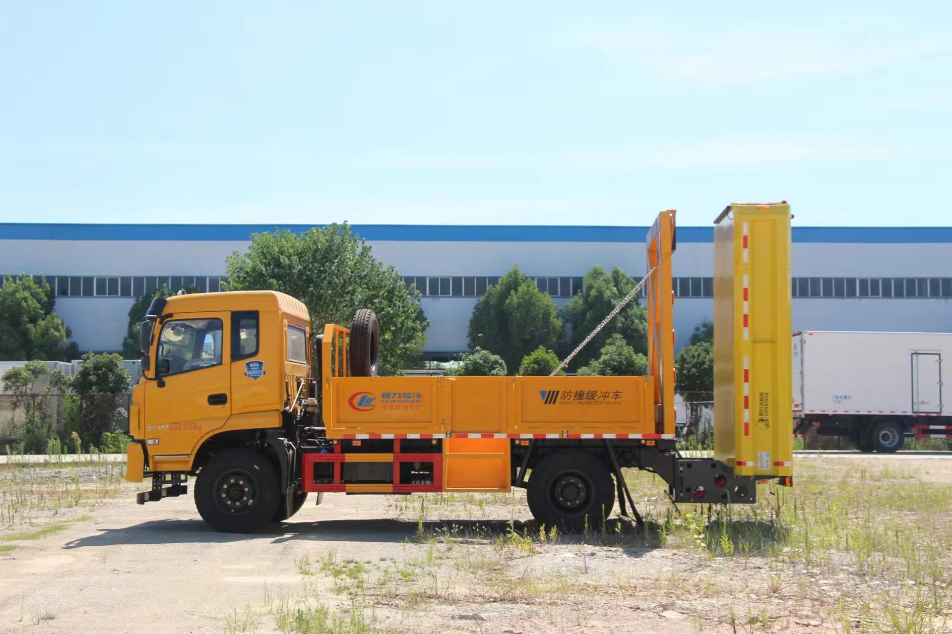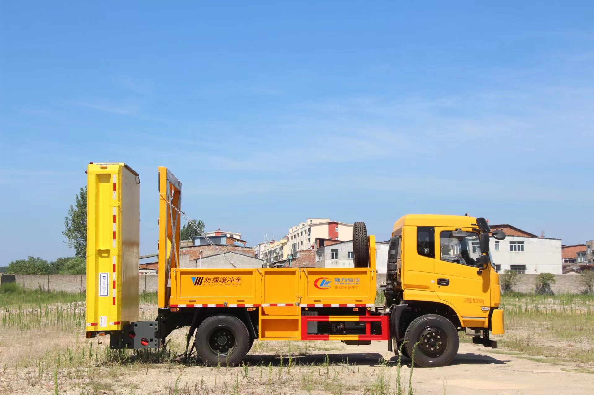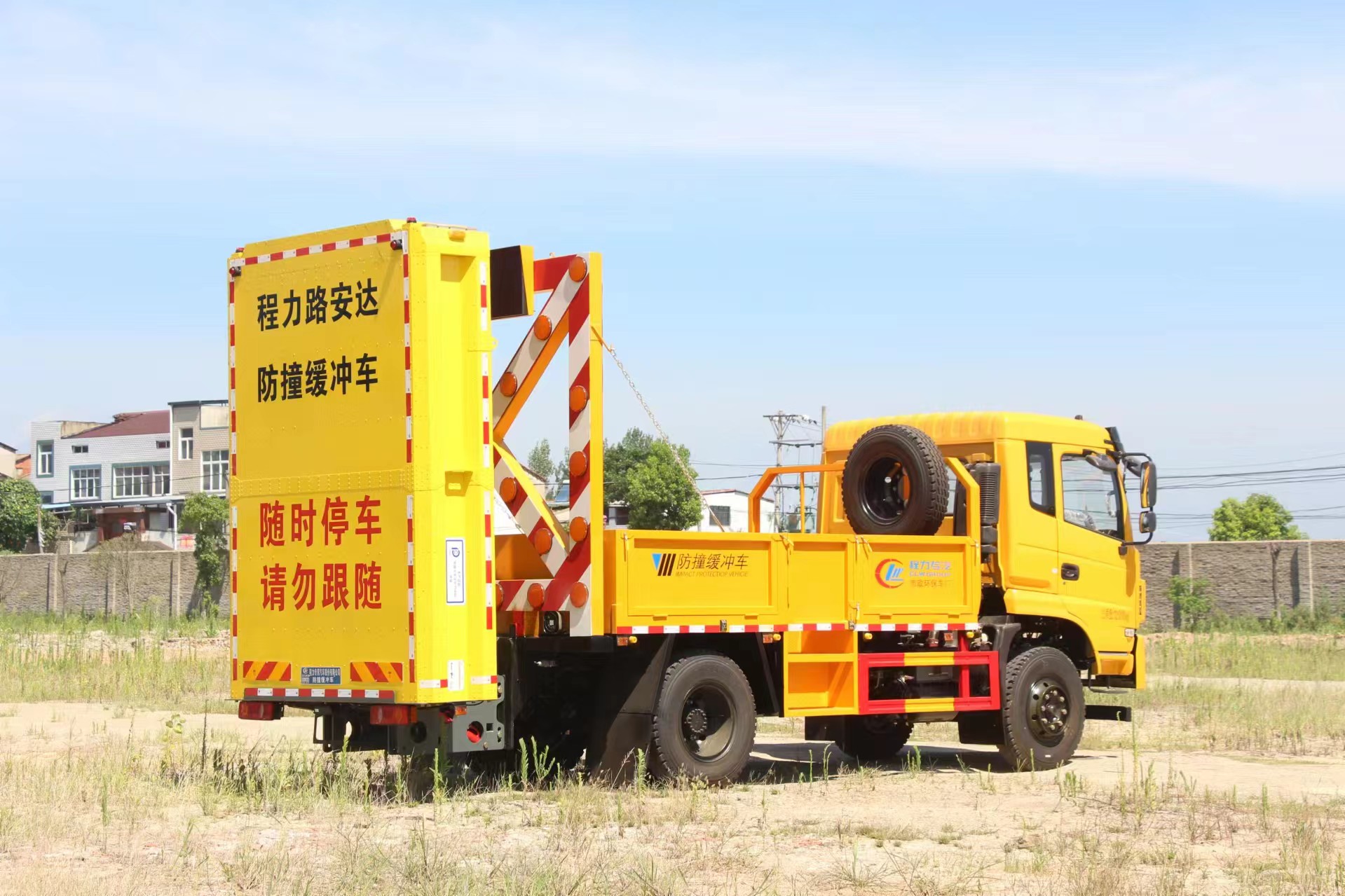 上裝配置 采用Q235國標邊3mm底板花紋板4mm厚,箱體后部防撞緩沖模塊包采用國際知名技術產品100E防撞緩 沖模塊,防撞緩沖吸能模塊主要由車載防撞緩沖墊和導向標志架組成,充當施工作業車輛后方的緩沖衛士。 如若發生追尾事故,能夠在肇事車輛和前方施工作業區域之間構建一個緩沖區域,通過機具結構變形吸收撞 擊的能量,最大限度地降低被保護人員及設備遭到碰撞的幾率。高性能液壓系統,可實現快速舉升和落下操 作,方便設備運輸轉場,一鍵啟動功能,舉升和落下防撞裝置,當防撞裝置未完全落下到工作位置或舉升到 垂直運輸位置時,會有自動警告音提示。