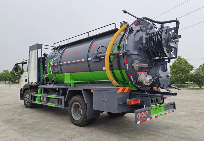 上裝配置 罐體容積約15方,8m碳鋼板材,清水約4方,其余為吸污,兩倉球閥互通。兩倉中間用封頭,品孚255流量高壓清洗泵,配60米高壓管。選裝安裝山東昊賽30水環泵配375馬力副發。卷盤裝后封頭180度旋轉,后封頭液壓打開。后封頭上一個600水泥蓋放污,可液壓開啟,側面一個6寸偷排閥,后封頭一個6寸出口,一個100寸進口直通罐頂,罐內鋪不銹鋼板,加強型車架,自卸車設計,罐體尾部箭頭燈,帶一個視污窗口。帶8米吸污管。其余廠內標配。