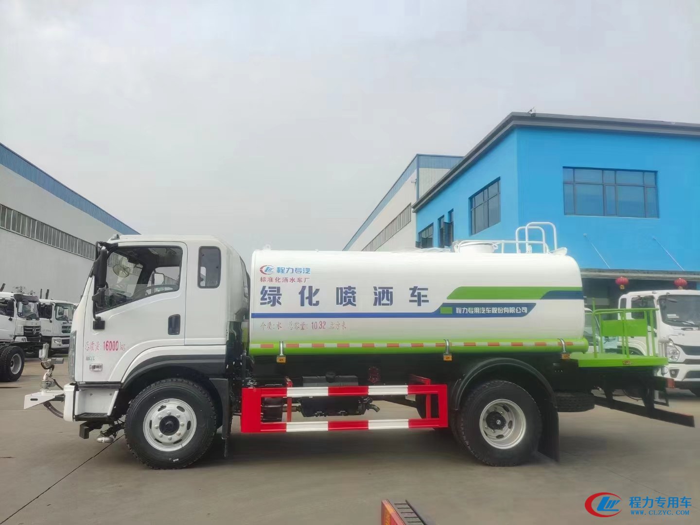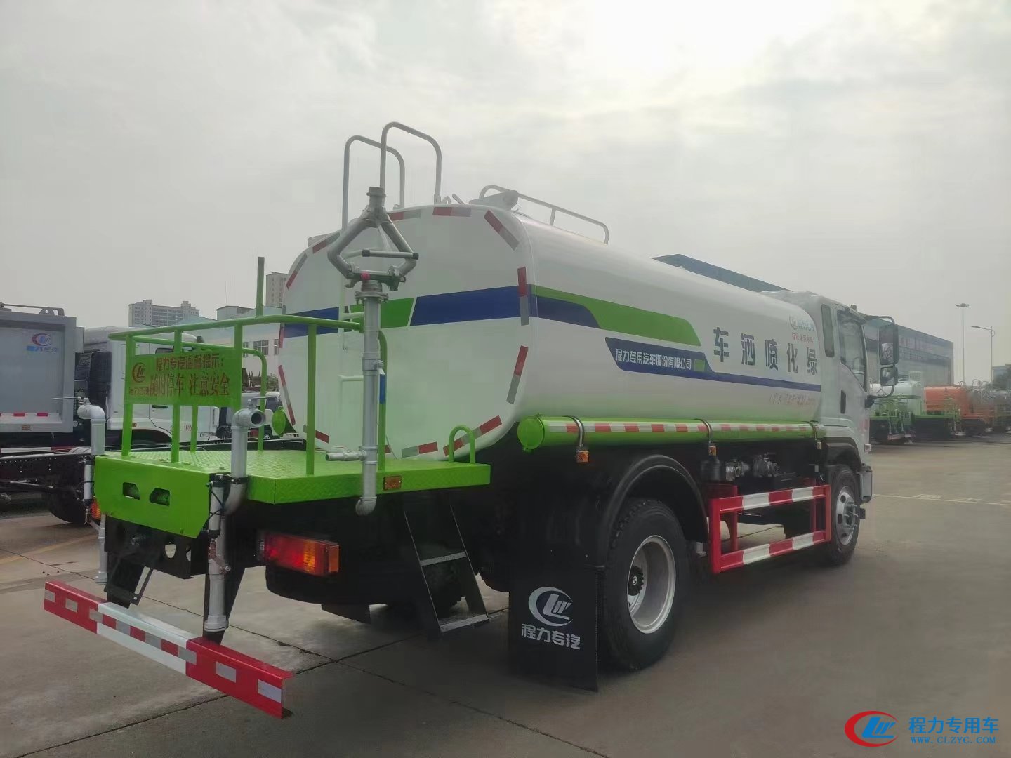 上裝配置 | 上裝武鋼優(yōu)質(zhì)碳鋼板,容積12立方,厚度4mm,封頭5mm,前后封頭機器人自動焊,內(nèi)設(shè)隔浪板,帶液位計, 配程力原廠大功率灑水泵,帶駕駛室電控操作,前沖后灑4個新式不銹鋼切斷閥,前沖 后灑 側(cè)噴 后高炮,后高炮可調(diào)節(jié)柱狀 雨狀和霧狀,新式?jīng)_孔工作平臺,主管道加粗,副管道全采用優(yōu)質(zhì)鍍鋅管道,帶自吸自排,自流閥,消防接頭,過濾裝置,邊燈帶電,其他標配… |